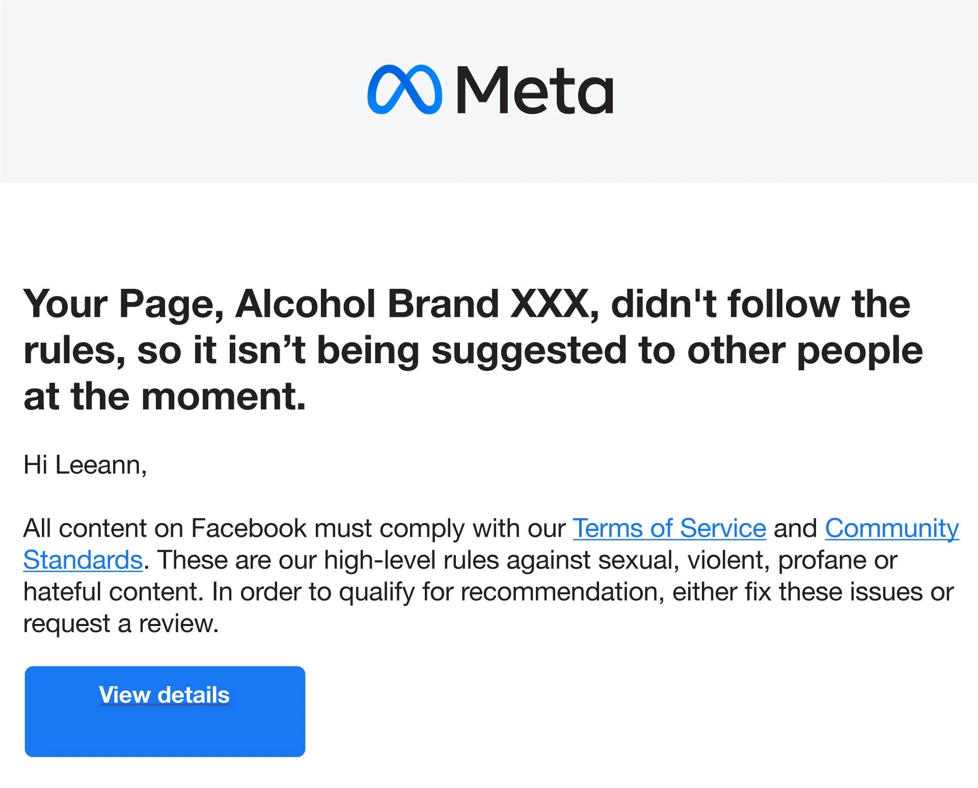 Facebook’s Community Standards determine what content is *allowed to exist* on the platform. Most wineries are fully compliant and remain in good standing. What has changed is *recommendation eligibility*, which Facebook controls separately and can adjust at any time under its Terms of Service.